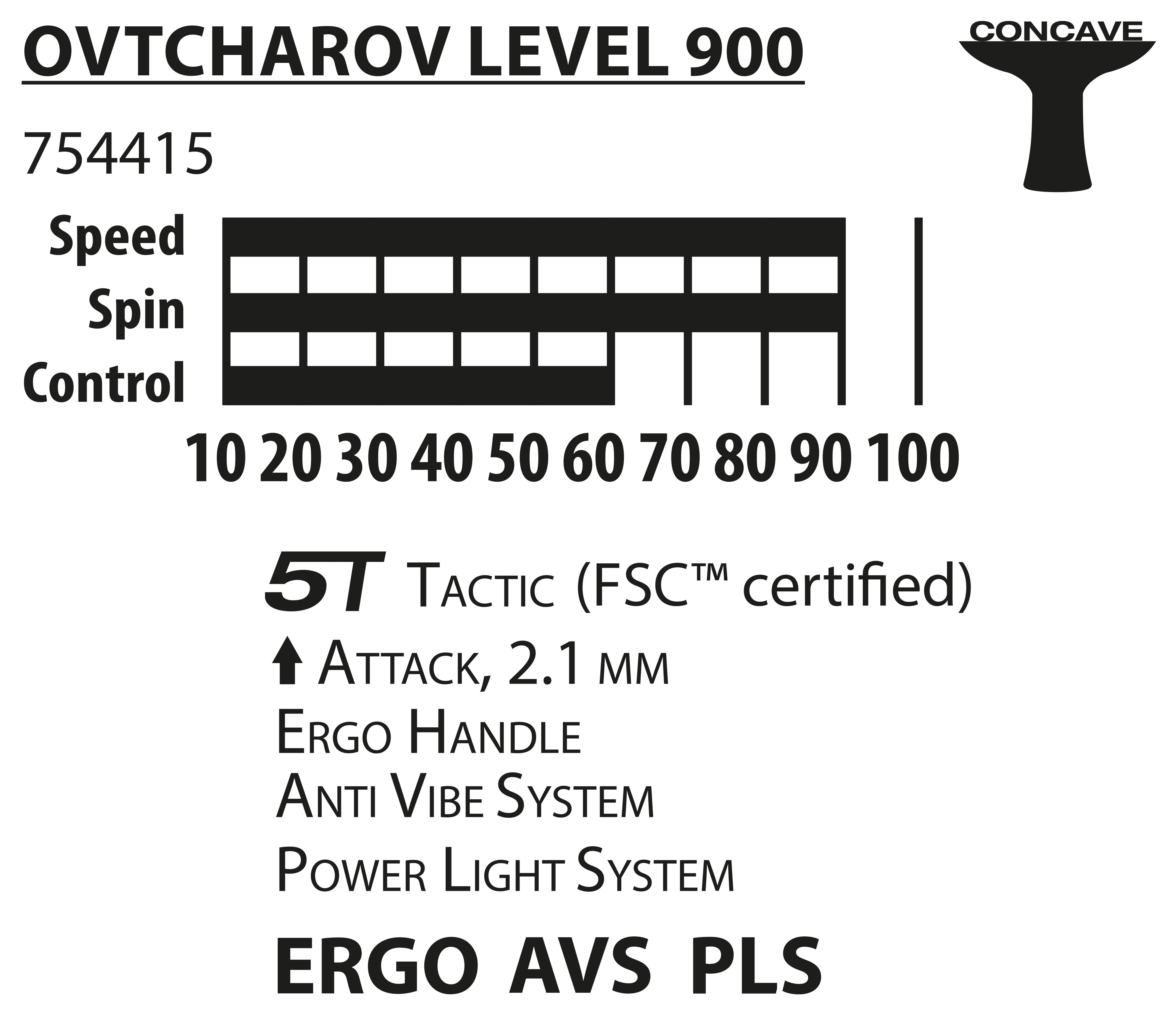 Level 900 bat made of FSC® wood for sophisticated play of all techniques with spin and high speed. Type of player: Attack.