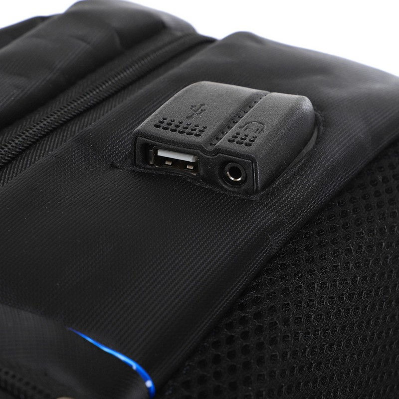 В рюкзаке предусмотрены разъемы для зарядки гаджетов и подключения наушников. Провода выходят в основное отделение.