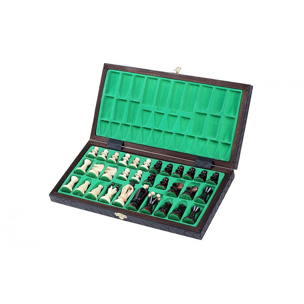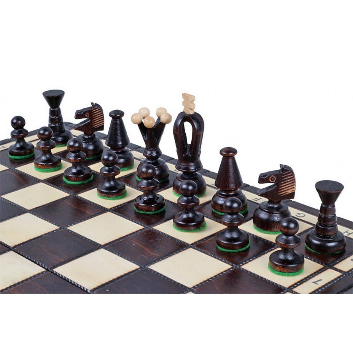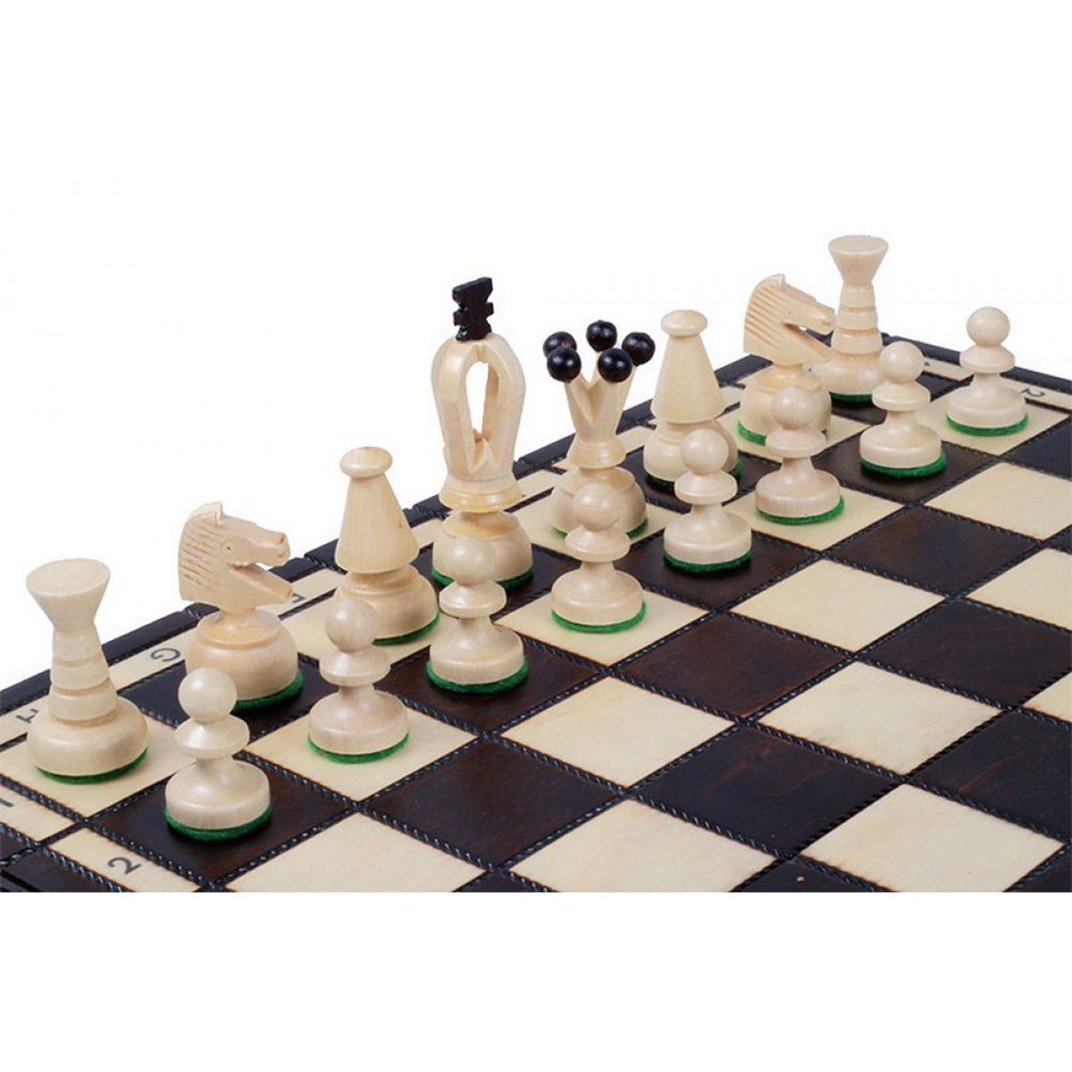 Шахматные фигуры выполнены в классическом стиле, что позволяет начальным игрокам без труда выучить название и значение фигур. Каждая фигура имеет тканевую подошву на основании, что защищает шахматную доску от царапин и повреждений.